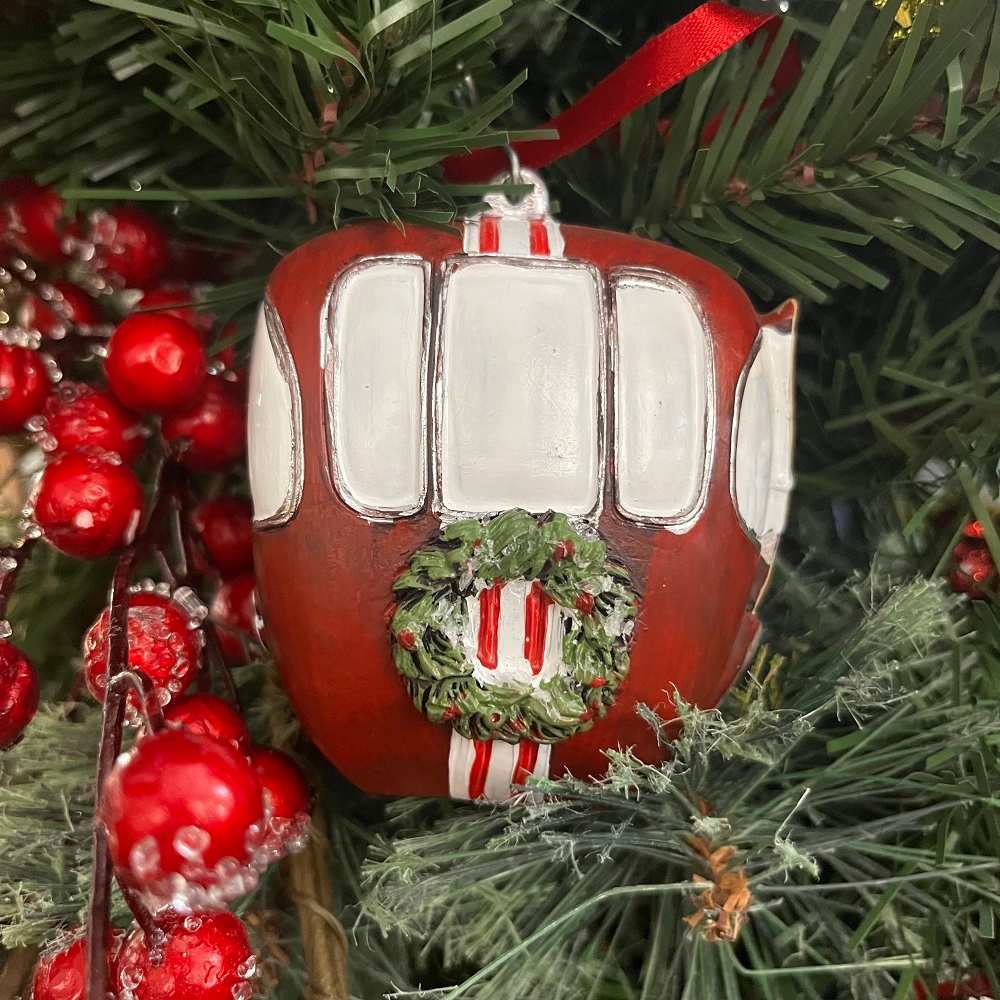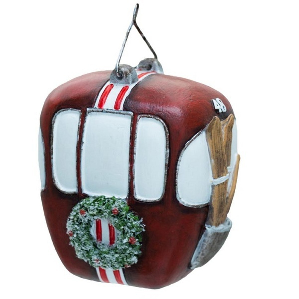 Новогоднее украшение в виде кабины канатной дороги. Окрашено в яркие цвета — основа красная, с белыми окнами и декоративной лентой с красными и белыми полосами. На передней части украшения изображен новогодний ёлочный венок, придающий праздничный настрой. Верх украшения оснащен металлическим крючком для подвешивания. Такое украшение отлично подойдет для тематической новогодней декорации, создавая атмосферу приключений и зимних развлечений.