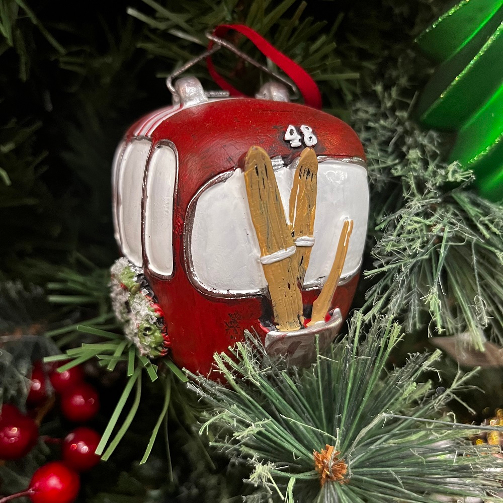 Новогоднее украшение в виде кабины канатной дороги. Окрашено в яркие цвета — основа красная, с белыми окнами и декоративной лентой с красными и белыми полосами. На передней части украшения изображен новогодний ёлочный венок, придающий праздничный настрой. Верх украшения оснащен металлическим крючком для подвешивания. Такое украшение отлично подойдет для тематической новогодней декорации, создавая атмосферу приключений и зимних развлечений.
