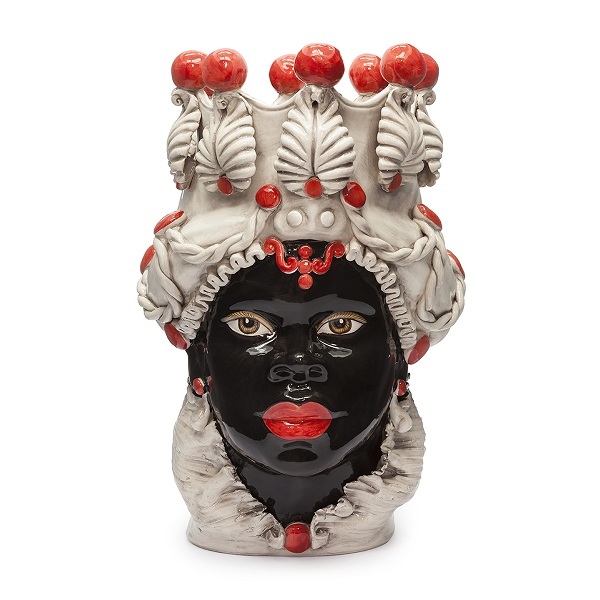 Эта ваза полностью изготовлена из керамики и расписана вручную. Очень необычная ваза в форме головы молодой мавританки, носящей высокий пернатый головной убор исламской традиции, правившей Сицилией с 965 по 1061 год и оказавшей влияние на сицилийское искусство и культуру.