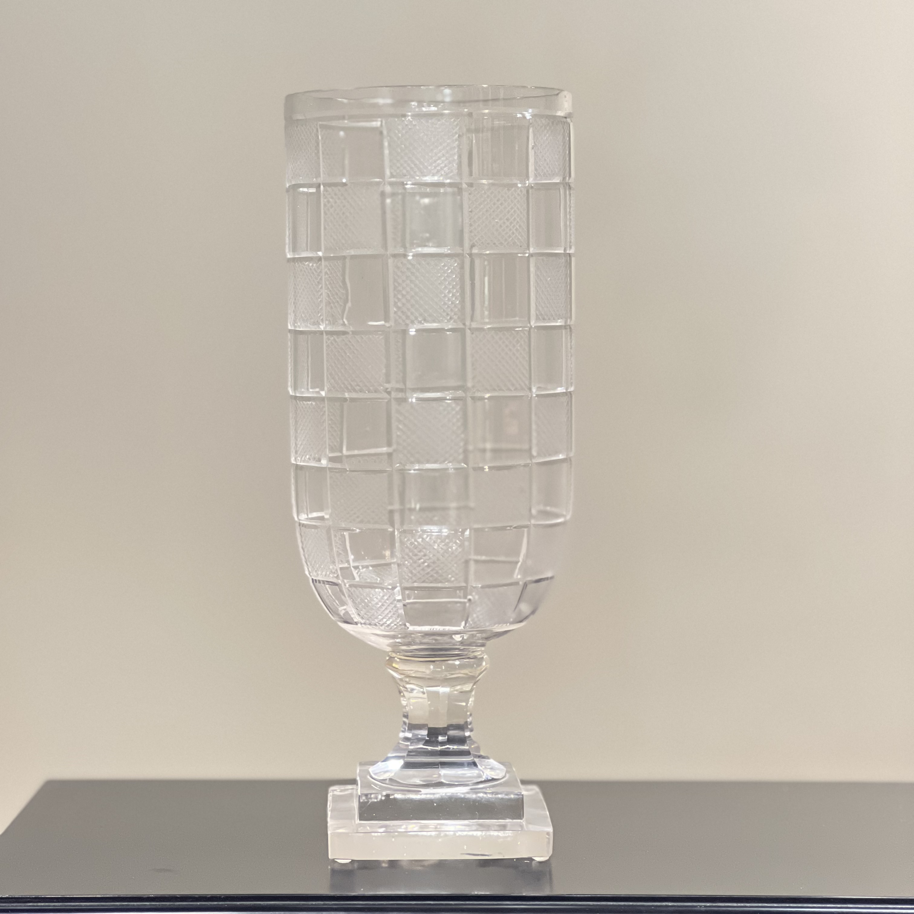 Ваза на ножке из выдувного прозрачного стекла с орнаментом. Можно использовать и как подсвечник.