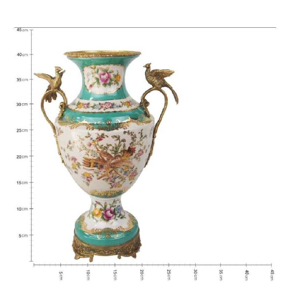 Ваза с птицами выполнена в классическом стиле, имеет две декоративные ручки по бокам и резную подставку-основание. Орнамент в виде птиц и цветов, словно приковывает взгляд. Двусторонняя.