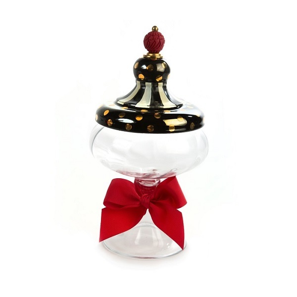Ваза с крышкой малая, расписанная вручную, с позолотой и блеском, коронованная резной ручкой из искусственной киновари, представляет собой шоу-стоппер - заполненная или пустая, благодаря щедрым пропорциям, замысловатым деталям и красивому красному банту.