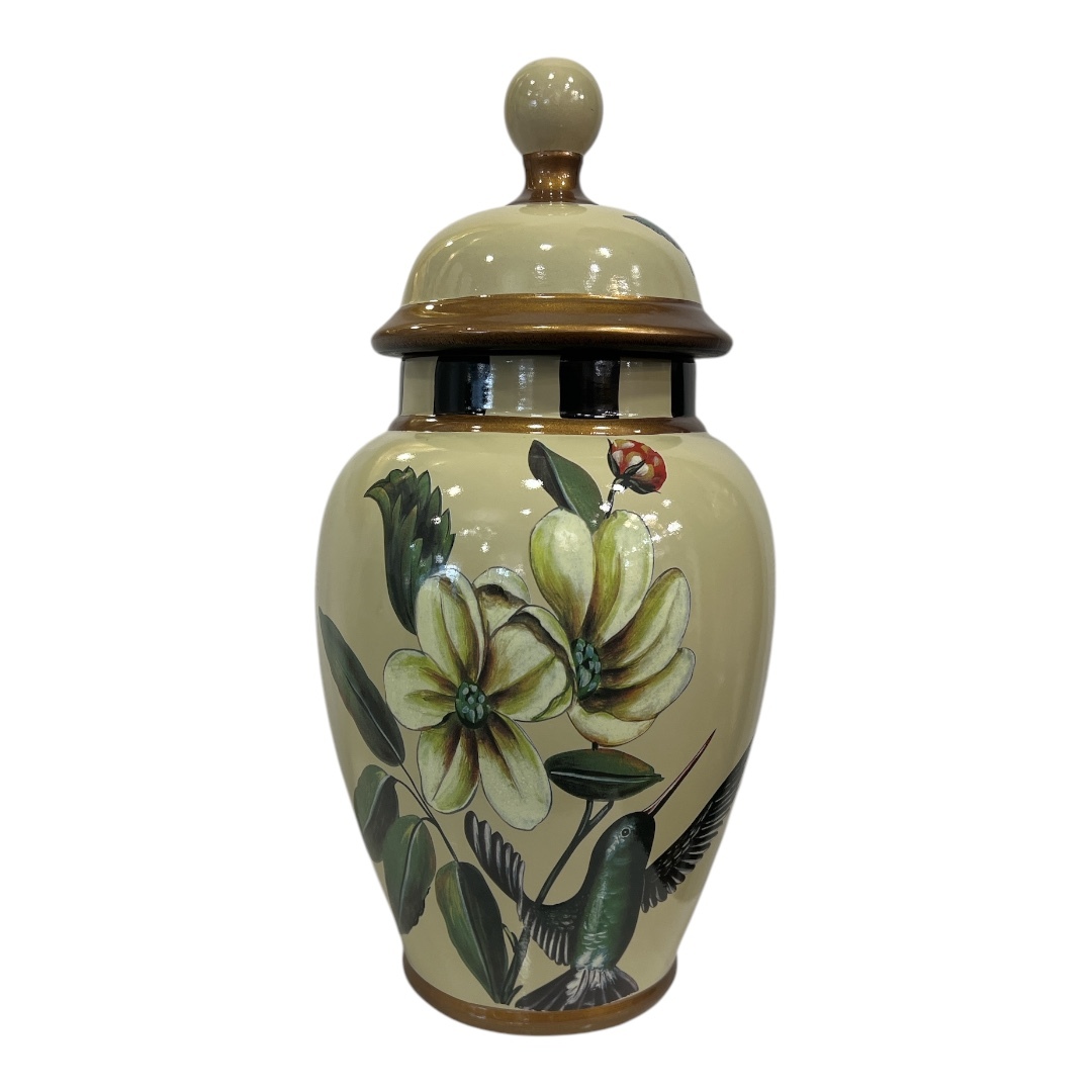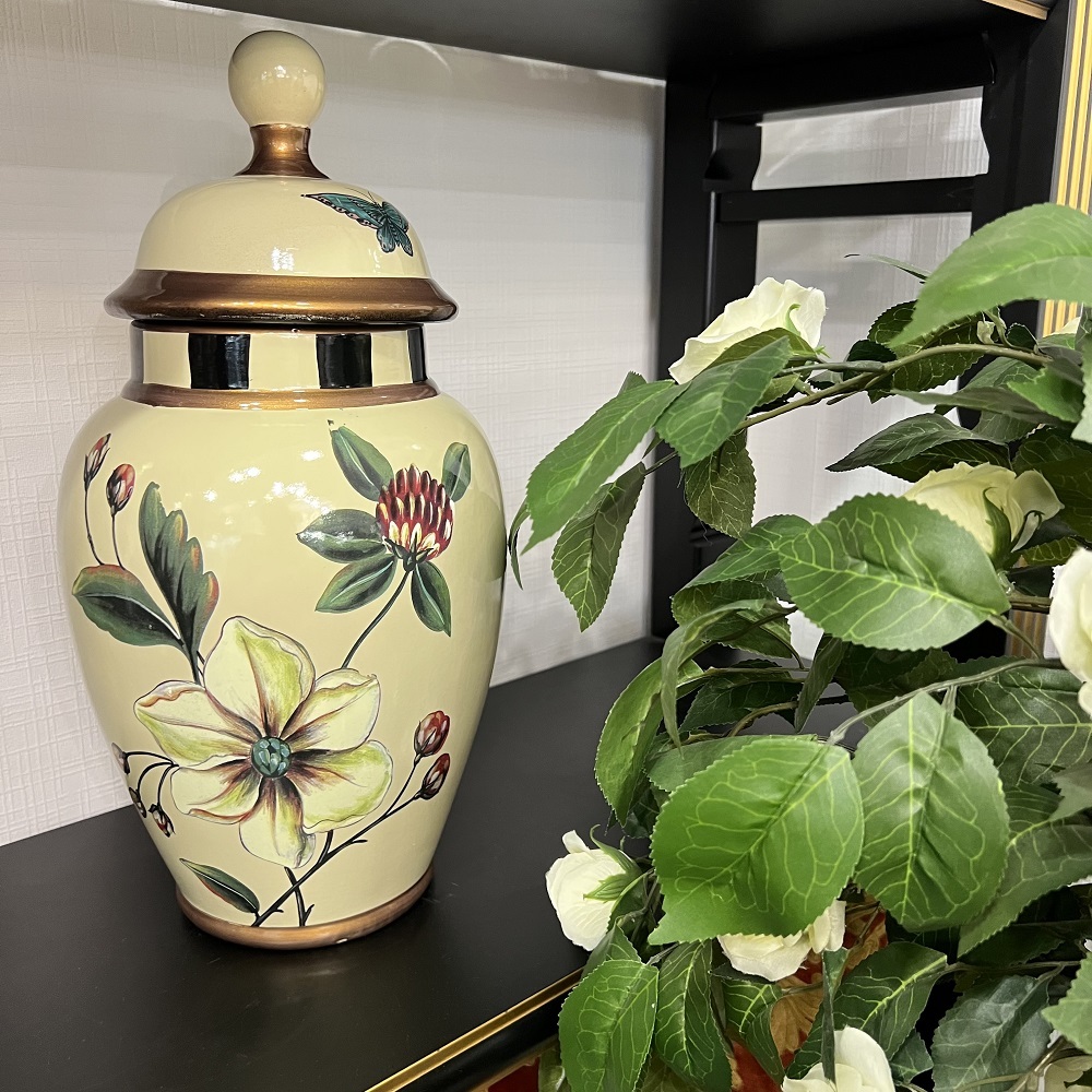 Бежевая керамическая ваза с крышкой, украшенная нежным цветочным узором в пастельных тонах. Идеально подходит для создания уютной атмосферы в гостиной, спальне или на кухне. Крышка плотно прилегает, защищая содержимое от пыли и влаги.