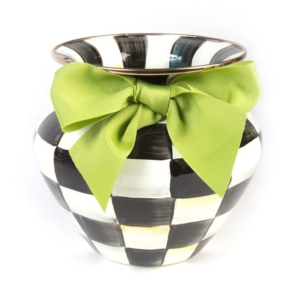 Маленькая и сбалансированная ваза с зеленой лентой из эмалированной стали раскрашенна вручную и украшена бронзовой окантовкой и ленточным бантом.