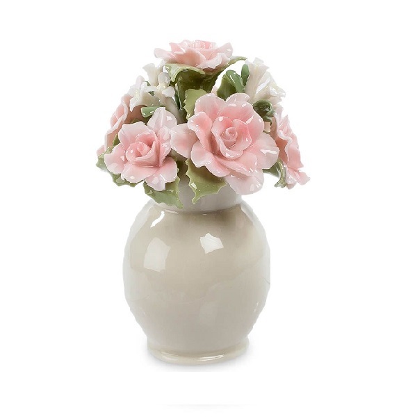 Этот миниатюрный сувенир исключительно красив. В маленькой фарфоровой вазочке расположился букетик нежных цветов. Бледно-розовые розы составляют его основу, но просматриваются и зелёные листья, и мелкие беленькие цветочки. Уменьшенная относительно натуральной величины композиция выполнена с такой тщательностью, что розочки кажутся живыми. Подарив такой букетик, можно быть уверенным, что ваш подарок никогда не забудут. Эти цветы не завянут через пару дней после торжества, места букет займёт немного, и ухода никакого не требует.