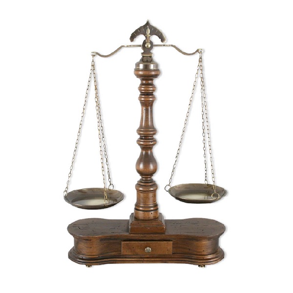 Оригинальная декоративная принадлежность для вашего интерьера, весы с подвесными латунными чашами на антуражной деревянной стойке.