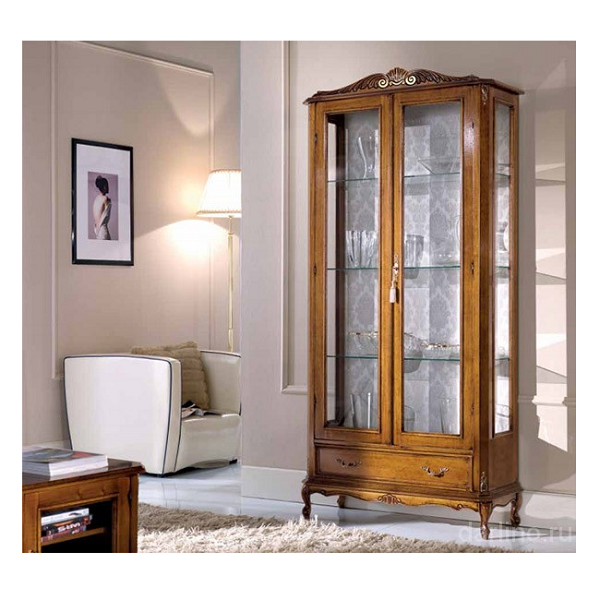 Несущие элементы мебели изготавливаются из массива дерева, поверхность покрывает ореховый шпон, который покрывается четырьмя слоями лака. Возможности трёхстороннего остекления и прозрачного наполнения оценят владельцы личных коллекций.
