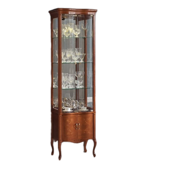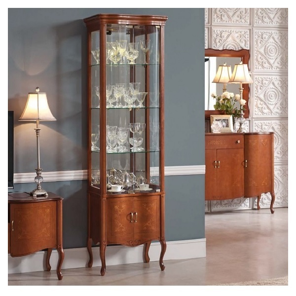 Узкая витрина выполнена из качественных и экологичных материалов, Относится к классическому стилю и станет прекрасным дополнением к интерьеру гостиной, столовой или кабинета в подобном стиле. Деревянный каркас обрамляют стеклянные стенки изделия. Витрина имеет несколько полок, также сделанных из стекла. В нижней части расположена секция, закрытая двумя дверцами, выполненными в форме волны. Украшена данная модель сдержанными резьбой, фурнитурой и оригинальным орнаментом. Держится витрина на четырех изогнутых ножках.
