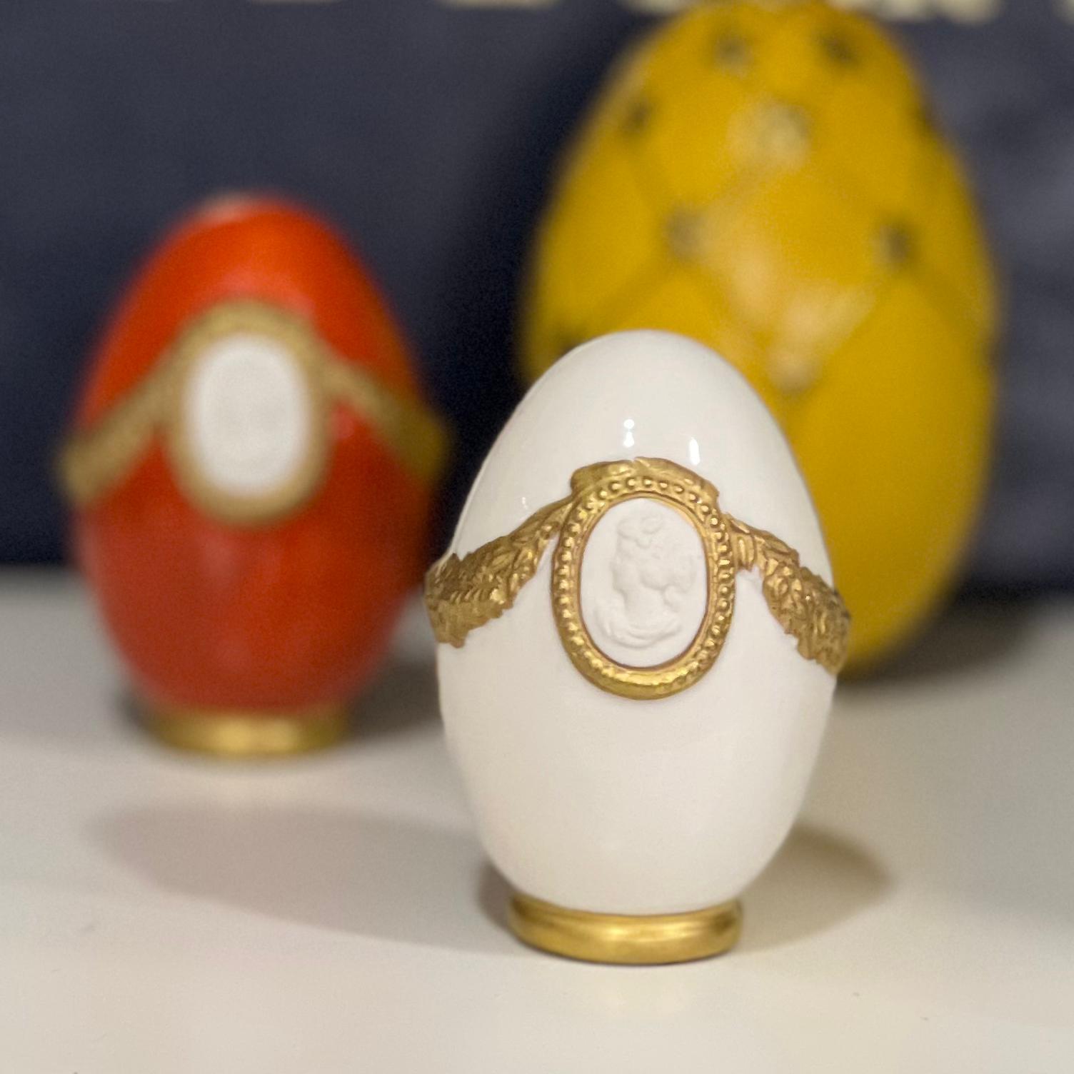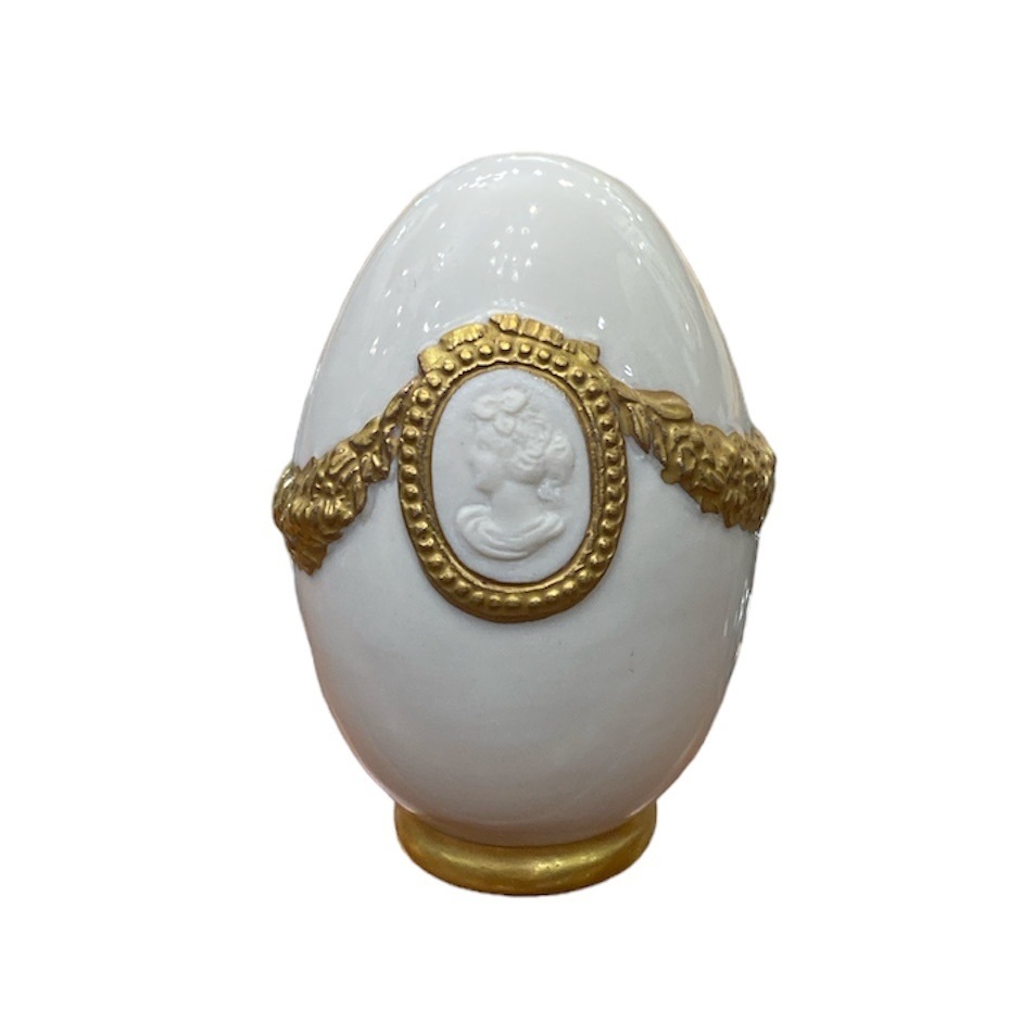 Статуэтка в виде яйца выполнена искусными итальянскими мастерами. Украшена резными узорами по золотой кайме. Декорирована 24-каратным золотом, что придает ей еще большую ценность. На каждом изделии стоит подпись автора Чезаре Виллари, что служит гарантией подлинности предмета.