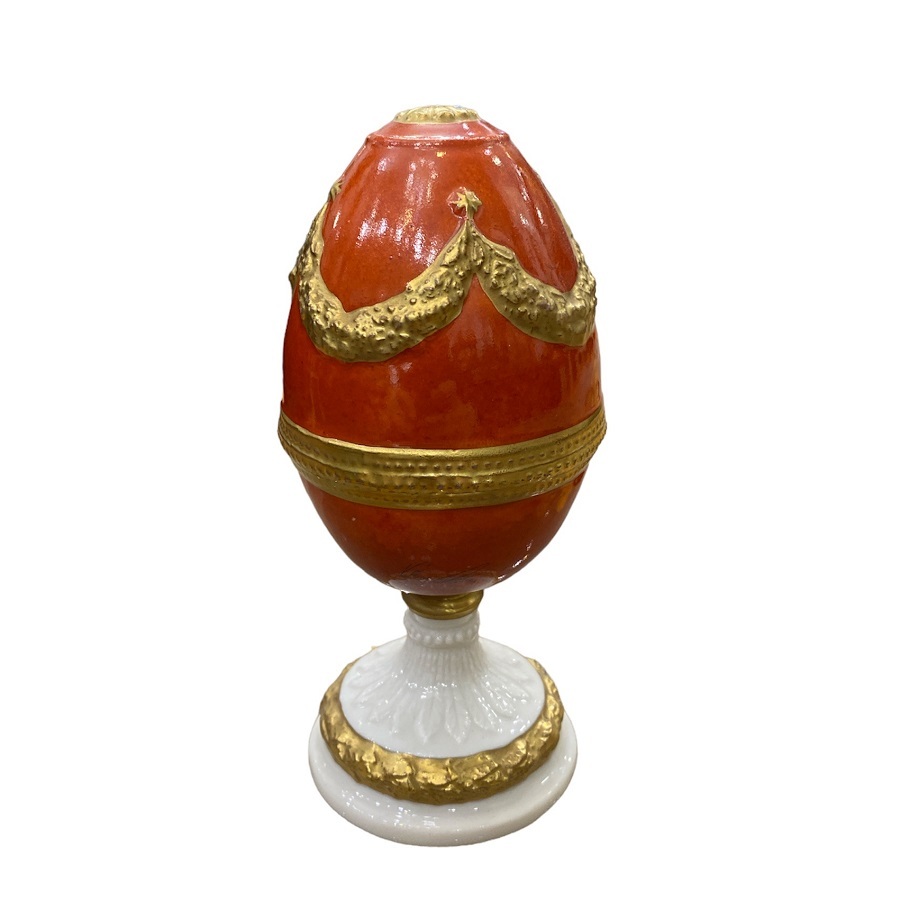 Статуэтка в виде яйца выполнена искусными итальянскими мастерами. Украшена резными узорами по золотой кайме. Декорирована 24-каратным золотом, что придает ей ещё большую ценность. На каждом изделии стоит подпись автора Чезаре Виллари, что служит гарантией подлинности предмета.