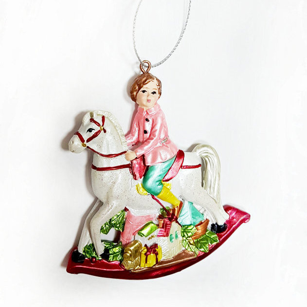Взгляните на эту ёлочную игрушку: милый мальчик Ганс играет в отважного наездника, оседлав свою любимую лошадь-качалку и совершенно позабыв про другие гостинцы, которые лежат возле него. Белая лошадка с ухоженной гривой и длинным хвостом готова унести своего друга в чудесные края и показать ему волшебные страны.
