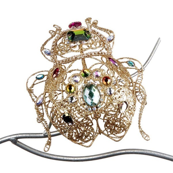 Драгоценный жук - изысканное украшение, выполненое вручную из декоративной проволоки, покрытой золотой краской. Акцентом декора являются стразы, которые выглядят так, словно это настоящие драгоценные камни. Крепится на ветку клипсой.
