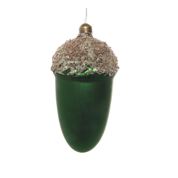 Стеклянные украшения ручной работы представлены в виде зелёных желудей. Новогодние подвески окрашены зелёной и золотой краской, а их шапочки выполнены из золотого стекляруса.